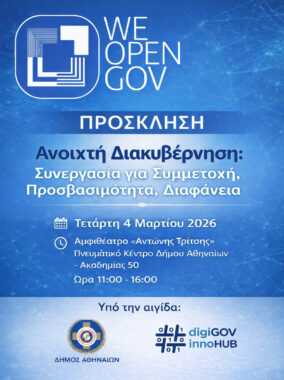 Την Τετάρτη 4 Μαρτίου 2026, στο Αμφιθέατρο «Αντώνης Τρίτσης» του Πνευματικού Κέντρου του Δήμου Αθηναίων (Ακαδημίας 50), θα πραγματοποιηθεί η φετινή εκδήλωση του WeOpenGov Forum, με θέμα «Ανοιχτή Διακυβέρνηση: Συνεργασία για Συμμετοχή, Προσβασιμότητα και Διαφάνεια». Η εκδήλωση τελεί υπό την αιγίδα του Δήμου Αθηναίων και του Ευρωπαϊκού Κόμβου Καινοτομίας για την Ψηφιακή Διακυβέρνηση GR digiGOV-innoHUB.