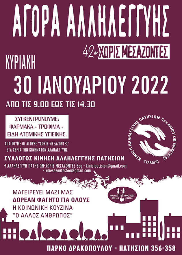 Στο Δήμο Αθηναίων θα πραγματοποιηθεί Αγορά Καταναλωτών από παραγωγούς – πωλητές στο χώρο του Πάρκου Δρακόπουλου στην οδό Πατησίων 356-358 την Κυριακή 30 Ιανουαρίου 2022 από τις 09:00 έως τις 14:30.