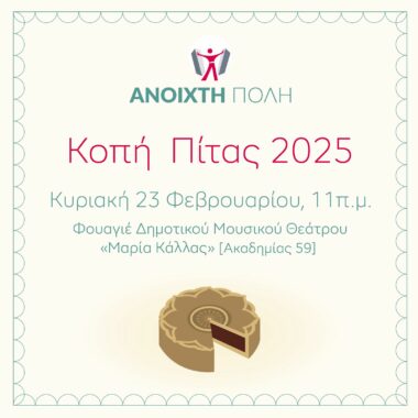 Η «Ανοιχτή Πόλη» θα κόψει την πίτα της για το 2025 την Κυριακή 23 Φεβρουαρίου στις 11πμ, στο φουαγιέ του Δημοτικού Μουσικού Θεάτρου της Αθήνας «Μαρία Κάλλας» (Ολύμπια), Ακαδημίας 59.