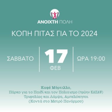 Η Ανοιχτή Πόλη κόβει την πίτα της για το 2024 στο Καφέ Μύρτιλλο (Τριφυλίας και Λάμψα Αμπελόκηποι), το Σάββατο 17 Φεβρουαρίου στις 7μμ.