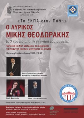 Το Εθνικό και Καποδιστριακό Πανεπιστήμιο Αθηνών και ο Δήμος Αθηναίων, στο πλαίσιο του κύκλου επιμορφωτικών, πολιτιστικών και καλλιτεχνικών δράσεων υπό τον τίτλο «Το ΕΚΠΑ στην Πόλη» (υπεύθυνος: καθηγητής Αχιλλέας Χαλδαιάκης), συνδιοργανώνουν, με την περίφημη Φιλαρμόνια Ορχήστρα Αθηνών, μία ξεχωριστή συναυλία με αφορμή την επέτειο των 100 χρόνων από τη γέννηση του Μίκη Θεοδωράκη.