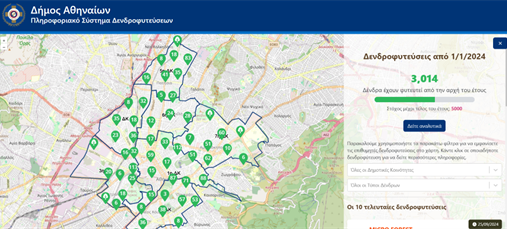 Η εφαρμογή Athens Trees είναι ένα βασικό εργαλείο για να το πετύχει αυτό, καθώς παρέχει πληροφορίες σε πραγματικό χρόνο στους κατοίκους και αλληλεπίδραση μαζί τους, συμβάλλοντας στις προσπάθειες του δήμου να αυξήσει τον αριθμό των φυτευμένων δέντρων και να μετριάσει το φαινόμενο της αστικής θερμικής νησίδας (https://athenstrees.cityofathens.gr/)