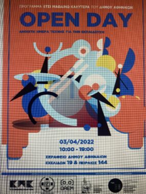Ο Δήμος Αθηναίων, σε συνεργασία με το Πολυτεχνείο Κρήτης και τη ΔΑΕΜ Α. Ε., σας προσκαλούν την Κυριακή, 03 Απριλίου 2022, 10:00-19:00, σε μια Ανοιχτή Εκδήλωση με δράσεις και εργαστήρια Τέχνης για την Εκπαίδευση, στο Σεράφειο του Δήμου Αθηναίων (Εχελιδών 19 & Πειραιώς 144, Κεντρική αίθουσα εκδηλώσεων).