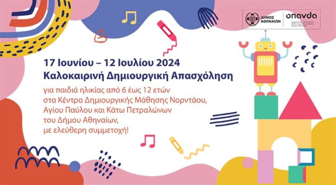 Τα Κέντρα Δημιουργικής Μάθησης Νορντάου και Αγίου Παύλου, καθώς και για πρώτη φορά το Κέντρο Δημιουργικής Κάτω Πετραλώνων υποδέχονται τα παιδιά ηλικίας από 6 έως 12 ετών (που έχουν γεννηθεί από το 2012 έως το 2017), από 17 Ιουνίου έως 12 Ιουλίου 2024, για να αξιοποιήσουν εποικοδομητικά τον ελεύθερό τους χρόνο αλλά και να διασκεδάσουν στο πρόγραμμα Δημιουργικής Απασχόλησης που προσφέρει δωρεάν και αυτό το καλοκαίρι ο Δήμος Αθηναίων.