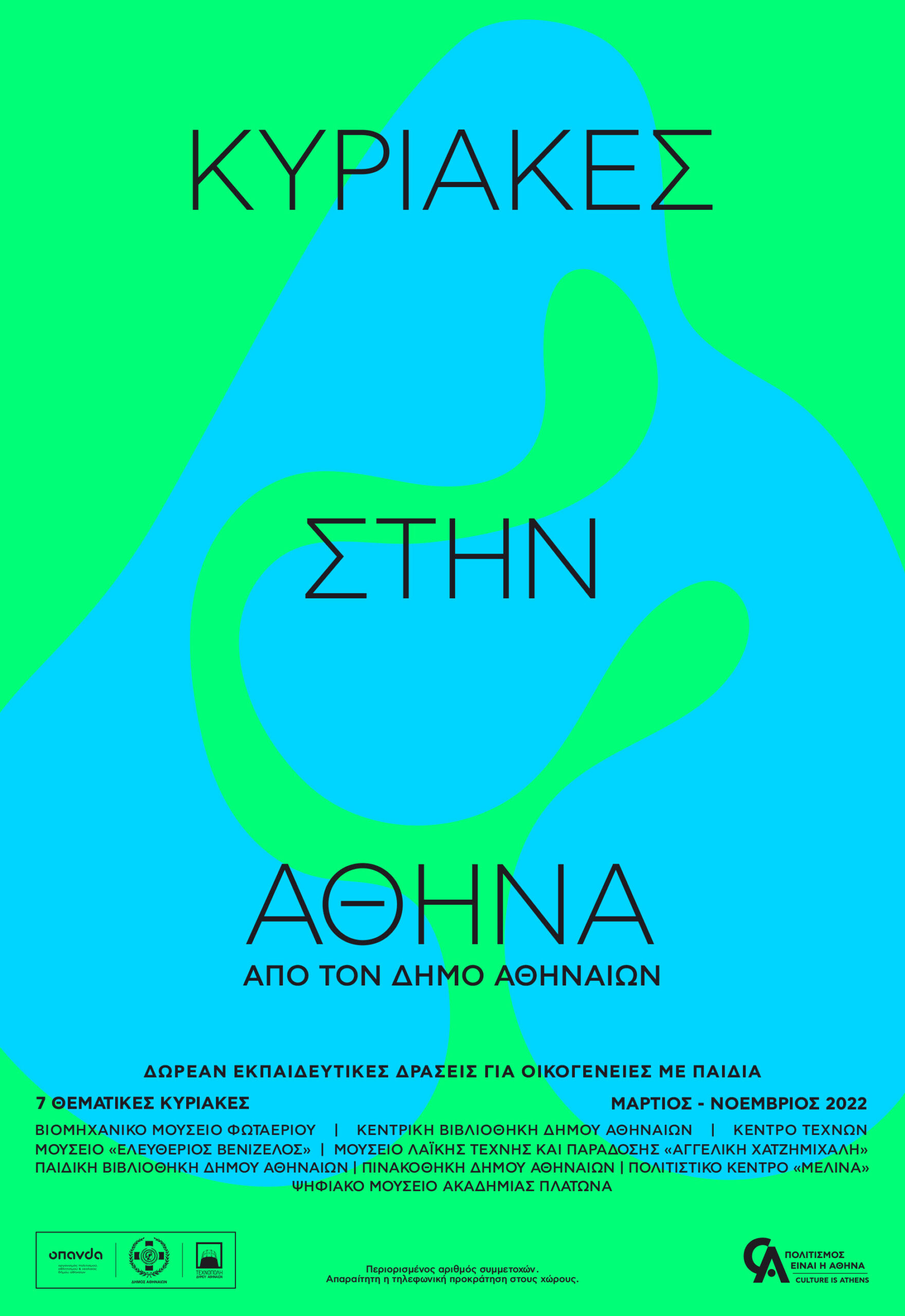 Στο πλαίσιο της δράσης για οικογένειες και παιδιά «Κυριακές στην Αθήνα» που εγκαινιάστηκε με μεγάλη επιτυχία τον Μάρτιο, ο Δήμος Αθηναίων προσκαλεί και πάλι μικρούς και μεγάλους σε επιλεγμένους πολιτιστικούς χώρους την Κυριακή 17 Απριλίου 2022 για να ανακαλύψουν αυτή τη φορά τις τέχνες, μέσα από ψυχαγωγικές δραστηριότητες δημιουργικής μάθησης, με ελεύθερη συμμετοχή.