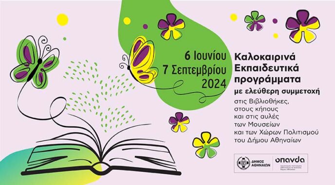 Ο Δήμος Αθηναίων διοργανώνει και αυτό το καλοκαίρι μια σειρά δωρεάν εκπαιδευτικών προγραμμάτων για τους μικρούς μας φίλους και όλη την οικογένεια, που θα υλοποιηθούν από τον Οργανισμό Πολιτισμού, Αθλητισμού και Νεολαίας του Δήμου Αθηναίων (ΟΠΑΝΔΑ), από 6 Ιουνίου έως 7 Σεπτεμβρίου 2024, στις Βιβλιοθήκες, στους πράσινους κήπους και τις αυλές των Μουσείων και των Χώρων Πολιτισμού του.