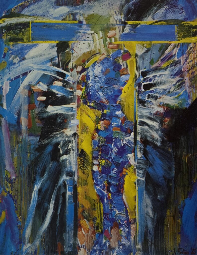 Η ζωγραφική του Φωκά δεν είναι τόσο αφηρημένη όσο δείχνει. Παρότι συγκαταλέγεται στους αφαιρετικούς ζωγράφους, δεν έκοψε ποτέ τους δεσμούς με την πραγματικότητα. Τα έργα που φτιάχνει τη δεκαετία του ’80 μεταφέρουν την αίσθηση των τοίχων, τα ίχνη των γκραφίτι, αυτό που συμβαίνει στην πόλη. Είναι η εποχή που ο ζωγράφος ζει σχεδόν μόνιμα στο Παρίσι και φωτογραφίζει ανελλιπώς τους αφηγηματικούς τοίχους της Πόλης του Φωτός. Κολλημένα χαρτιά, κολλάζ, γάζες, σπρέι, γραφές, σχισίματα, γδαρσίματα, ύλες που κολλάει και μετά ξεκολλάει, συνθέτουν τη φυσιογνωμία αυτών των χειρονομιακών έργων. Είναι η εποχή που δουλεύει πολύ με τα χέρια, ζωγραφίζοντας με τα δάχτυλα, πλάθοντας στον μουσαμά μικρές εκρήξεις. Ο πίνακας, συνήθως μεγάλων διαστάσεων, δεν έχει μια καθορισμένη θέση ή φορά: άλλοτε τον βάζει κάθετα κι άλλοτε οριζόντια, παίζοντας έτσι με τη γωνία θέασης. Αλλά το βασικό γνώρισμα αυτής της ζωγραφικής είναι η πολλαπλότητά της, το γεγονός ότι μέσα σε έναν πίνακα υπάρχουν πολλοί άλλοι. Αυτή η ιδιότητα -πολλοί πίνακες σε έναν- σου αποκαλύπτεται όταν απομονώσεις με το μάτι ή με την κάμερα λεπτομέρειες έργων του. Γενικά, ο ζωγράφος παίζει άλλοτε με το γήινο και άλλοτε με το ουράνιο, ενίοτε συνδυάζοντας και τα δύο. Το βέβαιο είναι πως ο άγριος εξπρεσιονισμός των έργων του της δεκαετίας του 1980 με την πάροδο των χρόνων εξημερώθηκε, έγινε πιο ήπιος, πιο στοχαστικός. Αλλά ο απώτερος στόχος του καλλιτέχνη παρέμεινε ο ίδιος: η επίμονη εξέταση του προβλήματος που λέγεται «ζωγραφική», η ανάλυση της εικόνας, της δομής, της επιφάνειας και της σύνθεσης.