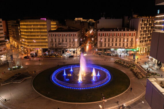 Στο πλαίσιο του εορτασμού της Ημέρας της Ευρώπης και ως ένδειξη συμπαράστασης στην Ουκρανία που πολεμάει και αντιστέκεται, ο Δήμος Αθηναίων φωταγώγησε το σιντριβάνι της Ομόνοιας με τα χρώματα της σημαίας της Ουκρανία.