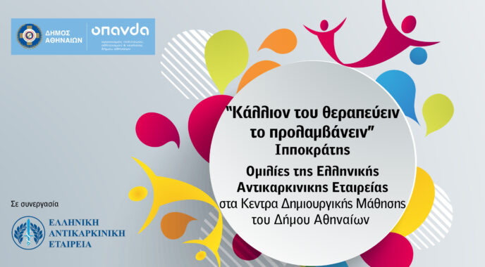 Στο πλαίσιο αυτό, ο Δήμος Αθηναίων θα πραγματοποιήσει ένα νέο κύκλο ομιλιών σε συνεργασία με την Ελληνική Αντικαρκινική Εταιρεία, τον Απρίλιο και τον Μάιο στα Κέντρα Δημιουργικής Μάθησης, ο οποίος αναδεικνύει τη σημασία της ρήσης «Κάλλιον του θεραπεύειν το προλαμβάνειν» του πατέρα της Ιατρικής Ιπποκράτη, ότι η πρόληψη είναι η ουσιαστική θωράκιση της υγείας μας έναντι των ενδεχόμενων κινδύνων.