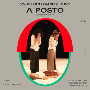 Η Ambra Senatore, διευθύντρια του Centre Chorégraphique de Nantes, παρουσιάζει το “A Posto”, έντεκα χρόνια μετά την δημιουργία του. Τρεις γυναίκες μπαίνουν και βγαίνουν από τη σκηνή, τα μάτια τους εξερευνούν τον χώρο αναζητώντας κάτι ή κάποιον. Όλα μοιάζουν να τους διαφεύγουν, οι χειρονομίες τους, τα αντικείμενα που ξεφεύγουν, κυλούν ή βυθίζονται. Αυτό το γοητευτικό ταμπλό γεμάτο φρεσκάδα κινείται διαρκώς μεταξύ μυθοπλασίας και πραγματικότητας για να δείξει ένα ανάλαφρο, ρευστό και άτακτο μπαλέτο που κρυφά γλιστράει με μικρές πινελιές σε ένα πιο αντισυμβατικό και δραματικό σενάριο. Μεταξύ πραγματικότητας και μυθοπλασίας, η Ambra Senatore χτίζει ένα χορογραφικό παζλ. Σαν αστυνομική ιστορία, το “A Posto” είναι χτισμένο σαν μια ταινία της οποίας οι παράξενες και μυστηριώδεις σκηνές εναλλάσσονται συνεχώς.