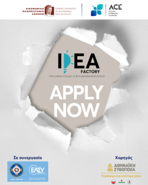 Το IDEA FACTORY (Innovation Design & Entrepreneurial Action) είναι ένα δια-πανεπιστημιακό πρόγραμμα ανάπτυξης επιχειρηματικών ιδεών που συνδυάζει γνώσεις, δεξιότητες καινοτομίας και συνεργασία μεταξύ φοιτητών και ερευνητών από διαφορετικά πεδία. Συντονίζεται από τη Μονάδα Μεταφοράς Τεχνολογίας και Καινοτομίας – ACE του Οικονομικού Πανεπιστημίου Αθηνών, σε συνεργασία με τον Αναπτυξιακό Οργανισμό «ΕΑΣΥ Α.Ε. ΑΟΤΑ» του Δήμου Αθηναίων.