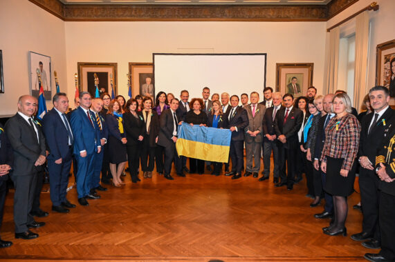 Συνολικά 28 Πρέσβεις και πολλοί εκπρόσωποι Πρεσβειών από όλο τον κόσμο έδωσαν το «παρών», μαζί με τον Δήμαρχο Αθηναίων, Κώστα Μπακογιάννη στο Δημαρχείο της Αθήνας για να δηλώσουν την έμπρακτη στήριξή τους στον Ουκρανικό λαό που εξακολουθεί -έναν χρόνο μετά τη ρωσική εισβολή- να αγωνίζεται για την ελευθερία του.