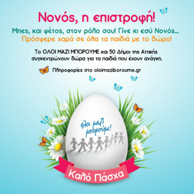Ο Δήμος Αθηναίων συντονίζεται με την πασχαλινή δράση του «Όλοι Μαζί Μπορούμε – Νονός η επιστροφή» και το Σάββατο 9 Απριλίου από τις 10.00 έως τις 14.00, συγκεντρώνει στην Πλατεία Κοτζιά πασχαλινά δώρα για τα παιδιά που έχουν ανάγκη.