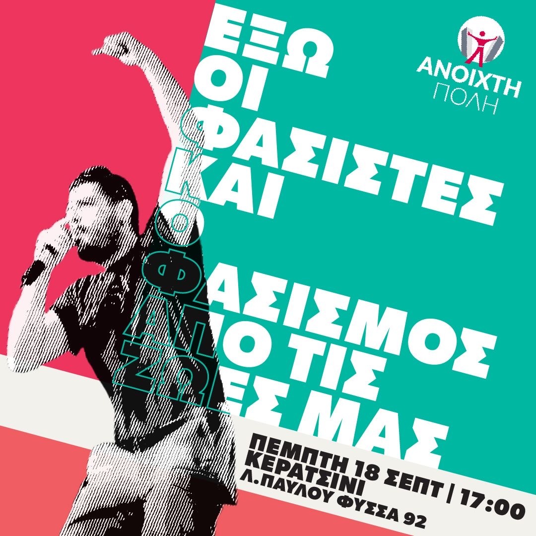 Την Πέμπτη 18 Σεπτεμβρίου, η Ανοιχτή Πόλη θα δώσει το παρών στην αντιφασιστική συγκέντρωση και πορεία στο Κερατσίνι, που θα ξεκινήσει στη Λ. Παύλου Φύσσα 92 στις 17:00. Και φέτος, οι δημοκρατικοί πολίτες θα διεκδικήσουμε να ζήσουμε με δικαιοσύνη και αλληλεγγύη, σε πόλεις ανθρωπιάς, κλειστές στο ρατσισμό και τη συντηρητική οπισθοδρόμηση.