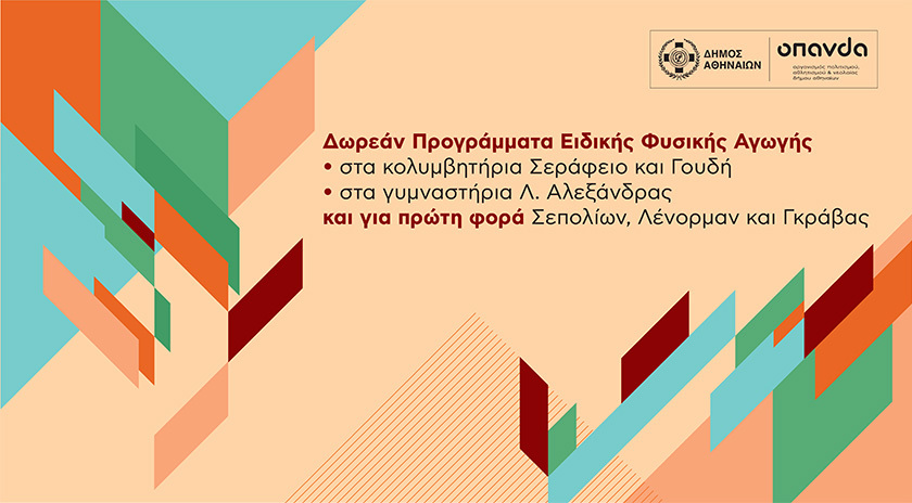 Για μία ακόμη χρονιά, o Δήμος Αθηναίων προσφέρει τη δυνατότητα σε παιδιά και ενήλικες με αναπηρία να συμμετέχουν δωρεάν στα ειδικά δομημένα προγράμματα της Γενικής Γραμματείας Αθλητισμού, τα οποία υλοποιούνται από τον Οργανισμό Πολιτισμού, Αθλητισμού και Νεολαίας Δήμου Αθηναίων (ΟΠΑΝΔΑ).